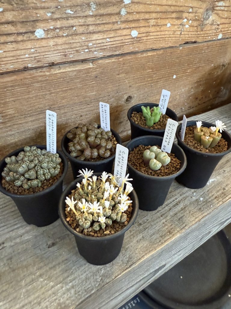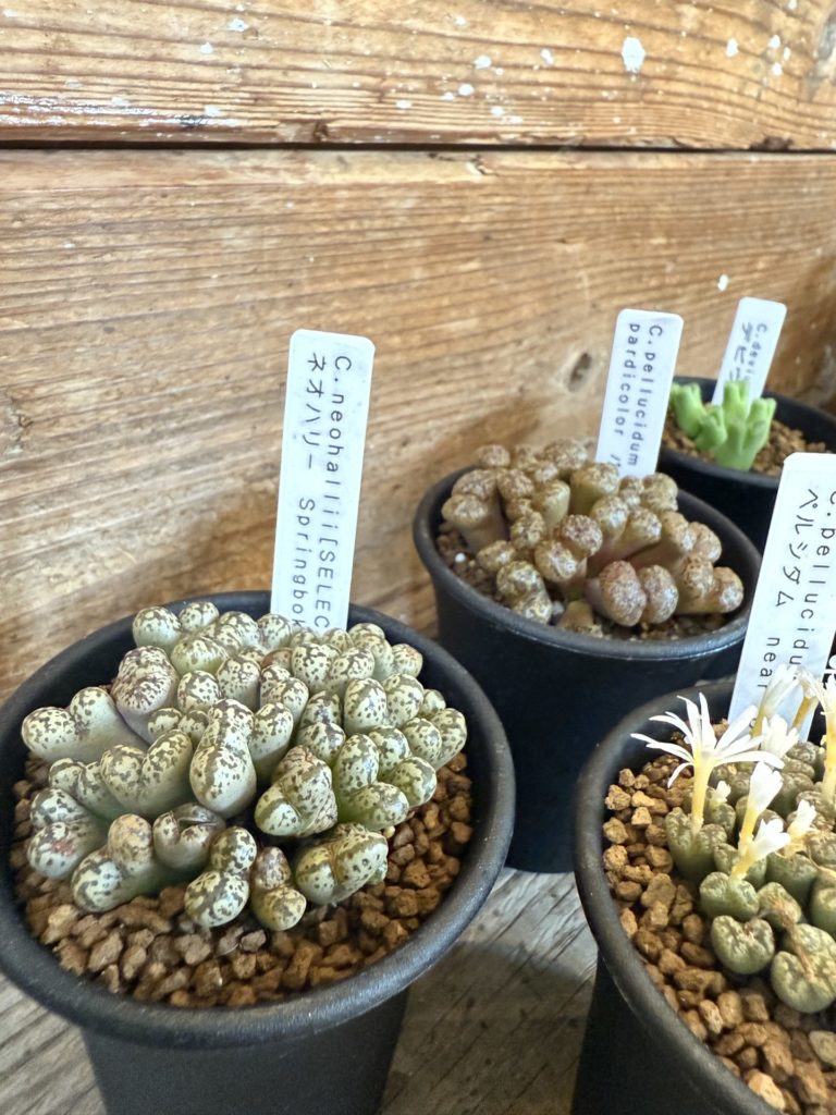 コノフィツムは小さな鉢でも存在感があり、並べるとまるで「宝石箱」のよう。個体ごとに色や模様が異なり、コレクション性の高い植物です。咲く花も白や黄色など可憐で、見ているだけで癒されます。
