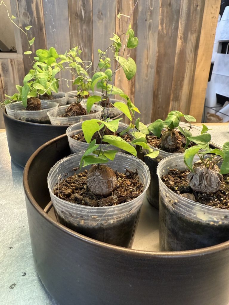 今回入荷したのは 2.5号ポット サイズ。手のひらに収まるほどのかわいらしいサイズ感ながら、すでに特徴的な“亀甲模様”の塊根が顔をのぞかせています。小さいうちから育てることで、長くその変化を楽しめるのも魅力のひとつです。